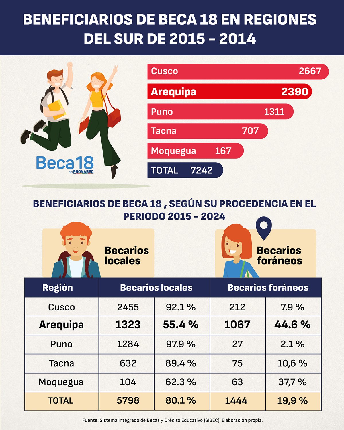 Según el Sistema Integrado de Becas y Crédito Educativo (Sibec), en los últimos diez años, el 44.6 % de subsidios entregados por Beca 18 en Arequipa, favoreció a jóvenes que provienen de otras regiones del Perú y el 55.4 % restante a becarios locales.
